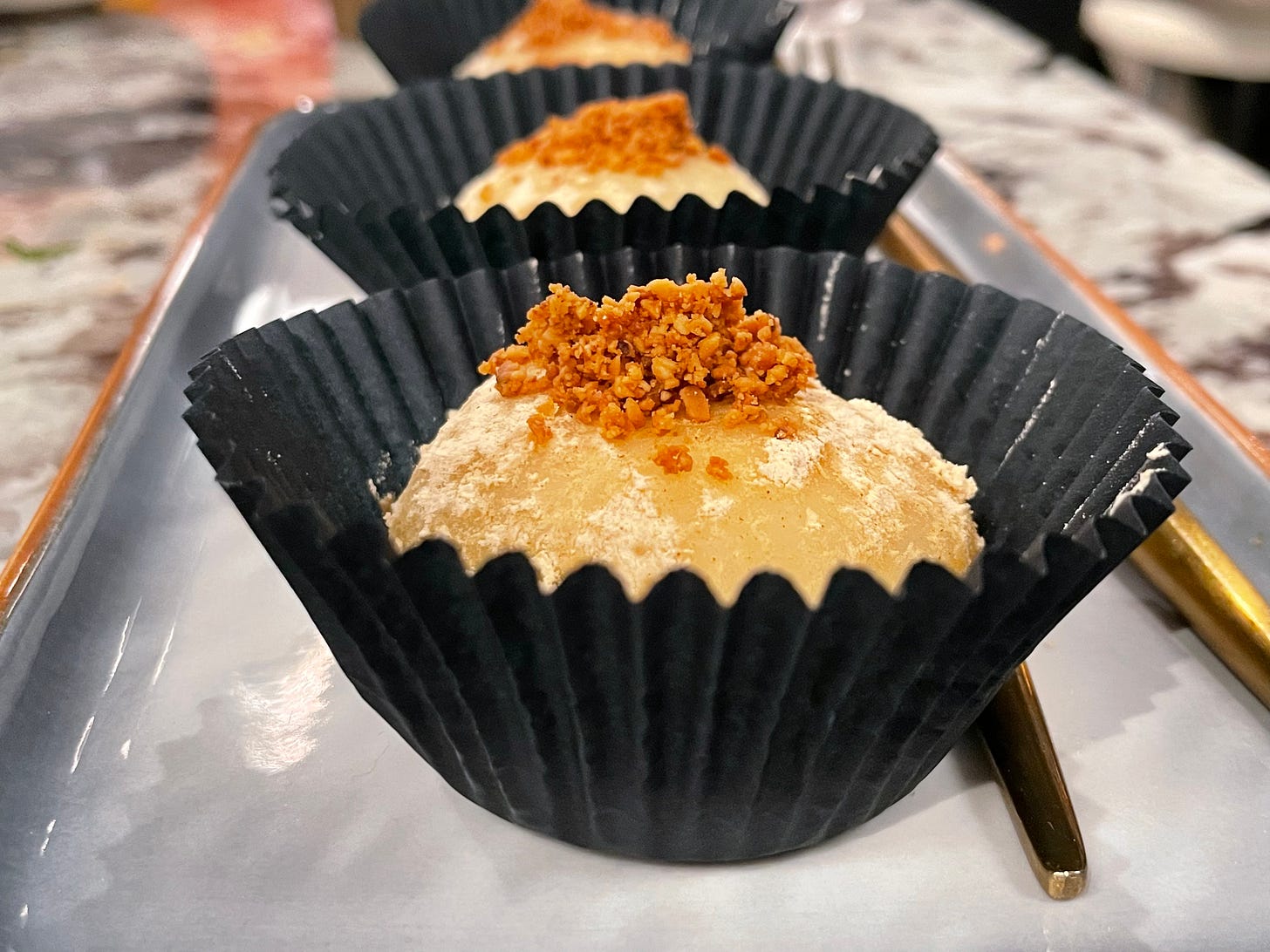 We ordered black sesame mochi with peanut for dessert because the black and gold lava buns weren’t available that day. Although that’s a nice flavor combo and they arrived warm, they didn’t have the kind of chew we are used to with mochi, and perhaps too much black sesame paste. But that’s just a minor critique.